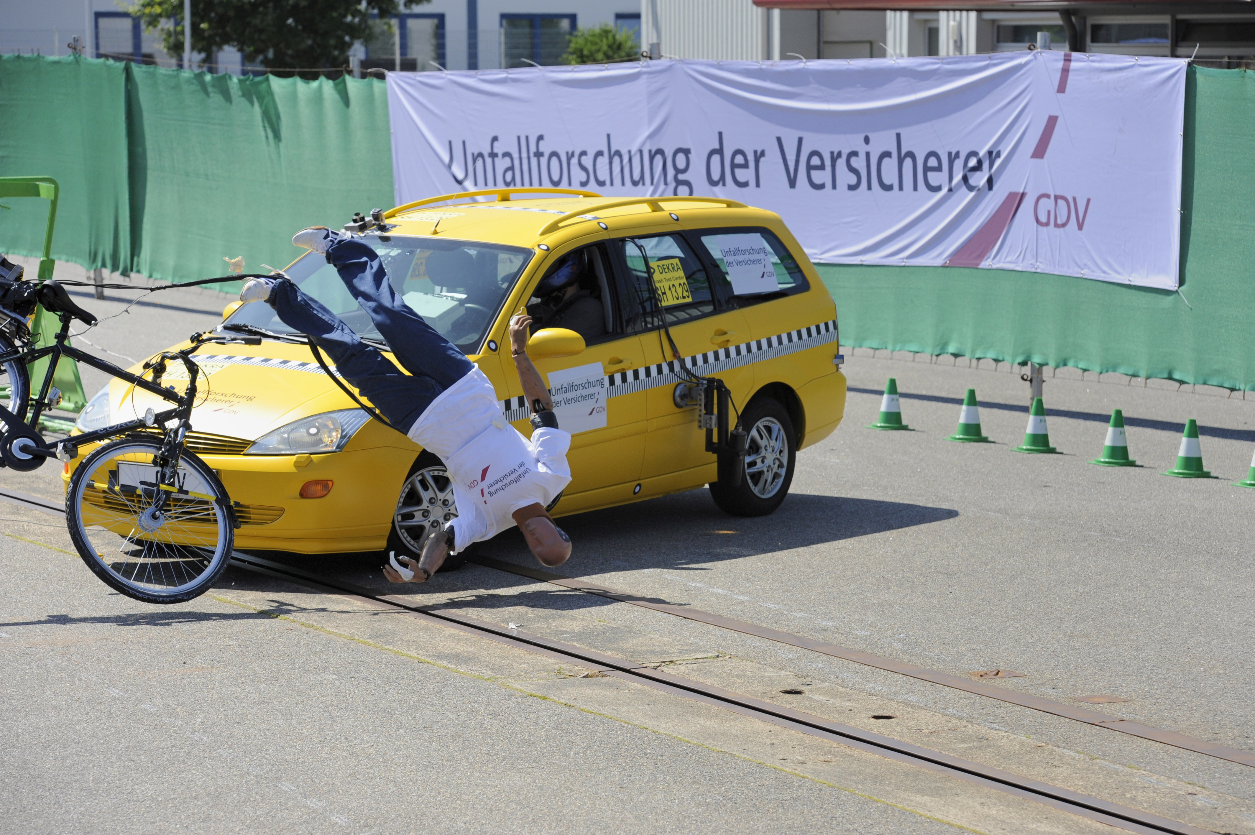 Autofahrer vergessen beim Abbiegen viel zu oft den Schulterblick oder können wegen Sichtbehinderungen und ungünstig geführter Radwege gar nichts sehen. Deshalb kommt es häufig zu schweren Unfällen mit geradeausfahrenden Radfahrern. Diese Konfliktsituation hat die UDV in einem Forschungsprojekt und einem Crashtest detailliert untersucht.